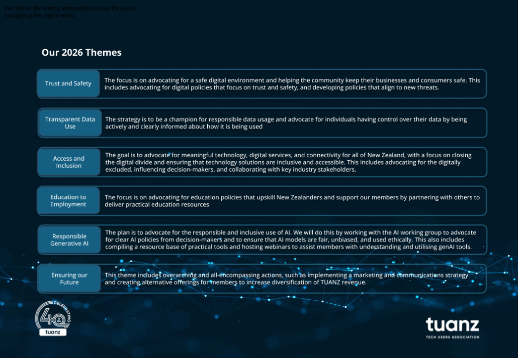 Our focus is on empowering technology users through education, advocacy, and the facilitation of meaningful connections. We strive to ensure that New Zealanders can confidently and effectively leverage technology to enhance productivity, innovation, and overall quality of life. We provide a platform for an informed and influential user voice, advocating for policies and practices that support positive technology outcomes for our members and the nation.
